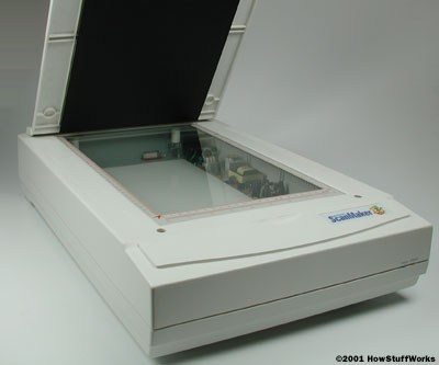 •The document is placed on the glass plate and the cover is closed. The inside of the cover in most scanners is flat white, although a few are black. The cover provides a uniform background that the scanner software can use as a reference point for determining the size of the document being scanned. Most flatbed scanners allow the cover to be removed for scanning a bulky object, such as a page in a thick book.